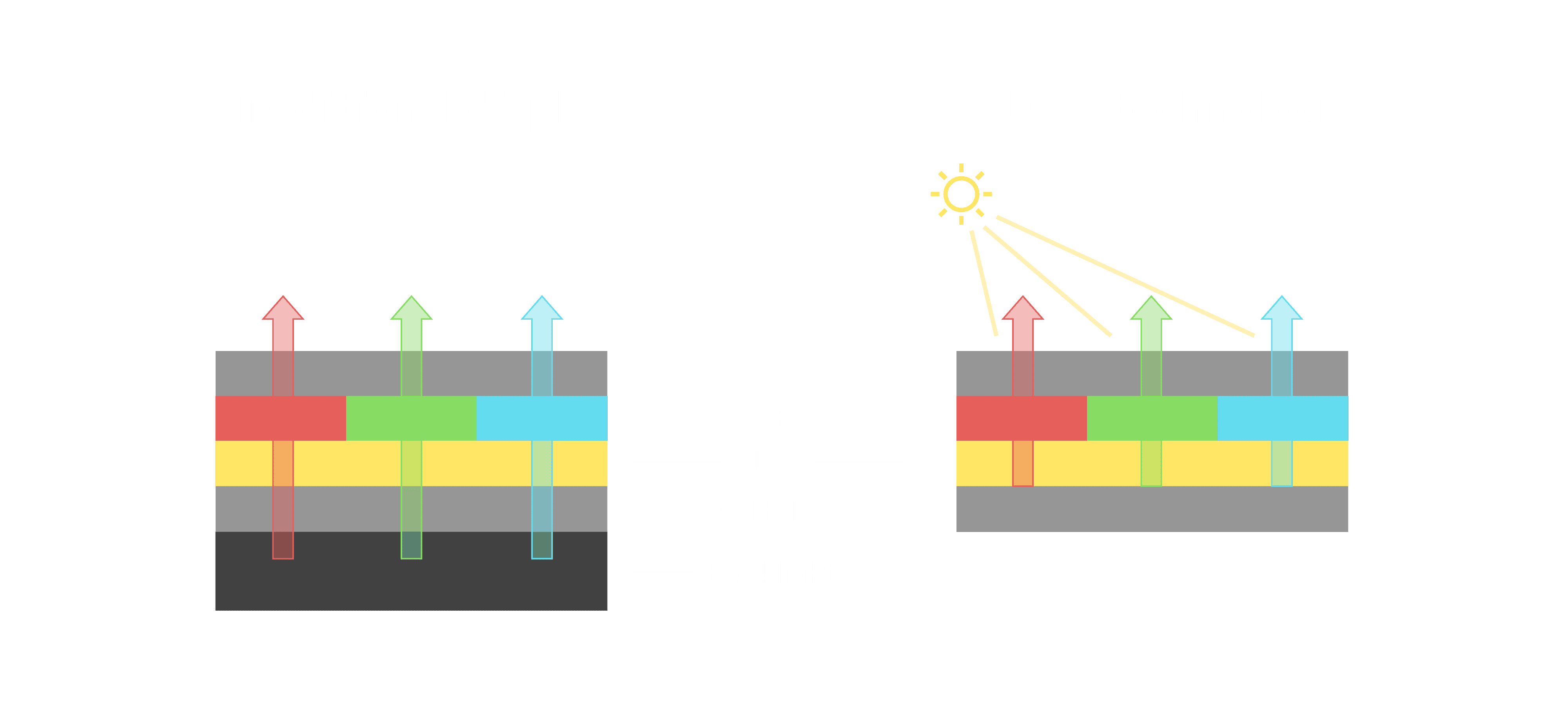 与传统需搭配背光单元的液晶显示相比,,反射式液晶技术不仅更省电、、更轻薄,,,且即便在艳阳下仍能清晰显示。。。此外,,,少了背光单元,,也大幅降低了 LED 蓝光伤害眼睛的疑虑。。。